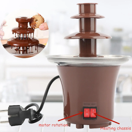 Diversión de fondue: hacer de esta una fiesta favorita: perfecta para fiestas de cumpleaños, reuniones familiares, bodas y baby showers. Disfruta con fresas, cuñas de manzana, cerezas, malvaviscos, palomitas de maíz y mucho más.Fuente estilo barrena: la fuente en espiral crea un hermoso efecto en cascada. Capacidad para 750 gramos de chocolate derretido.Tres niveles y fácil instalación: esta fuente profesional de chocolate tiene 3 niveles. Fácil de montar y desmontar, lo que hace que la instalación y limpieza sea muy fácil.Fácil operación: las funciones separadas de calefacción y motor te permiten derretir el chocolate antes de arrancar el motor para un efecto de fuente, y el calentamiento continuo garantiza que el chocolate permanezca líquido durante el tiempo que lo necesites.Consejos y trucos: Para que la fuente de chocolate fluya rápidamente, derrite el chocolate con una doble caldera o en el microondas hasta que el chocolate adquiera una textura fluida, vierte el chocolate derretido en el tazón de la fondue de queso y enciende el motor, verás cómo el chocolate está subiendo y comenzará a fluir. POLITICAS DE GARANTIA, CAMBIOS Y CAUSALES PARA DEVOLUCION.1. PEDIDO INCOMPLETO - Que solicites mas de una unidad y te llegue solo una.2. MALFUNCIONAMIENTO - Que no cumpla con tus expectativas con respecto a lo que se te ofrece o que el mismo tenga algún defecto mas no por mal uso.3. PRODUCTO ROTO – Que el producto te llegue roto ya sea por mal embalaje o mal trato de la transportadora 4. PRODUCTO EQUIVOCADO – Que enviemos algo diferente a lo que nos solicitas.5. Los productos que tienen contacto con la piel no cubren garantía una vez lo use el cliente este punto se refiere a las (DEPILADORAS Y AFEITADORAS)6. Se debe enviar una buena evidencia es decir un videos mostrando claramente cuál es el daño o inconformidad con el producto no se aceptan solo fotos.7. Por favor a la hora de la devolución de las garantía se debe enviar con todas sus piezas incluyendo su caja, se debe enviar envuelto en cartón, si el producto llega a nuestra bodega sin ninguna protección no se aceptara la garantía.Tienes un plazo máximo De 10 Días para reportar el causal de garantía.